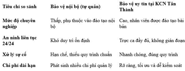 So với bảo vệ nội bộ, dịch vụ bảo vệ uy tín tại KCN Tân Thành mang lại sự chuyên nghiệp, an toàn và yên tâm lâu dài.